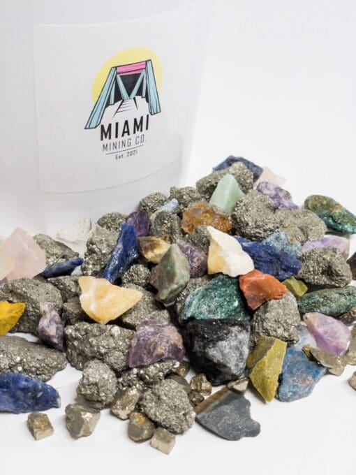 3 lbs Bucket Option: You will receive 3 lbs of our mining rough, which consists of 12+ ounces of gemstone mix and 1lbs of Pyrite mix. It also includes a detailed Educational Gemstone ID Postcard. The one quart pail is re-usable and can be used to store your crystals.